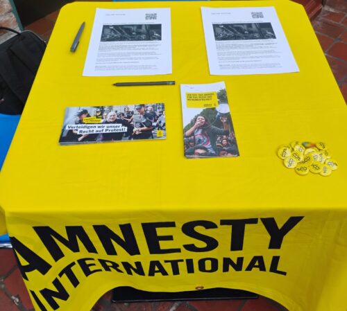 Am 10. 04.2026 wurde im Theater im Ballsaal in Bonn-Endenich Das TAGEBUCH VOM ENDE DER WELT von Natalja Kljutscharjowa aufgeführt. Wir waren mit einem Infostand vor der Aufführung mit einem Infostand zum Recht auf Protest vertreten. Das Theaterstück handelt von dem Tagebuch, in dem die Autorin ab dem Beginn des des russischen Überfalls auf die Ukraine für ein Jahr lang in Miniaturen ihre Handlungen, Gedanken und Gefühle festhält und vom Mut und der Zivilcourage derjenigen erzählt, die trotz aussichtsloser Lage protestieren.